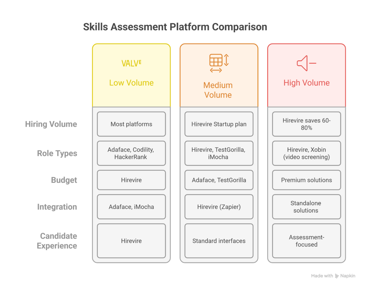 Budget: Tight budgets demand Hirevire. Moderate budgets support Adaface ($900-$3,000/year) or TestGorilla. Enterprise budgets accommodate premium solutions ($5,000-$50,000+).