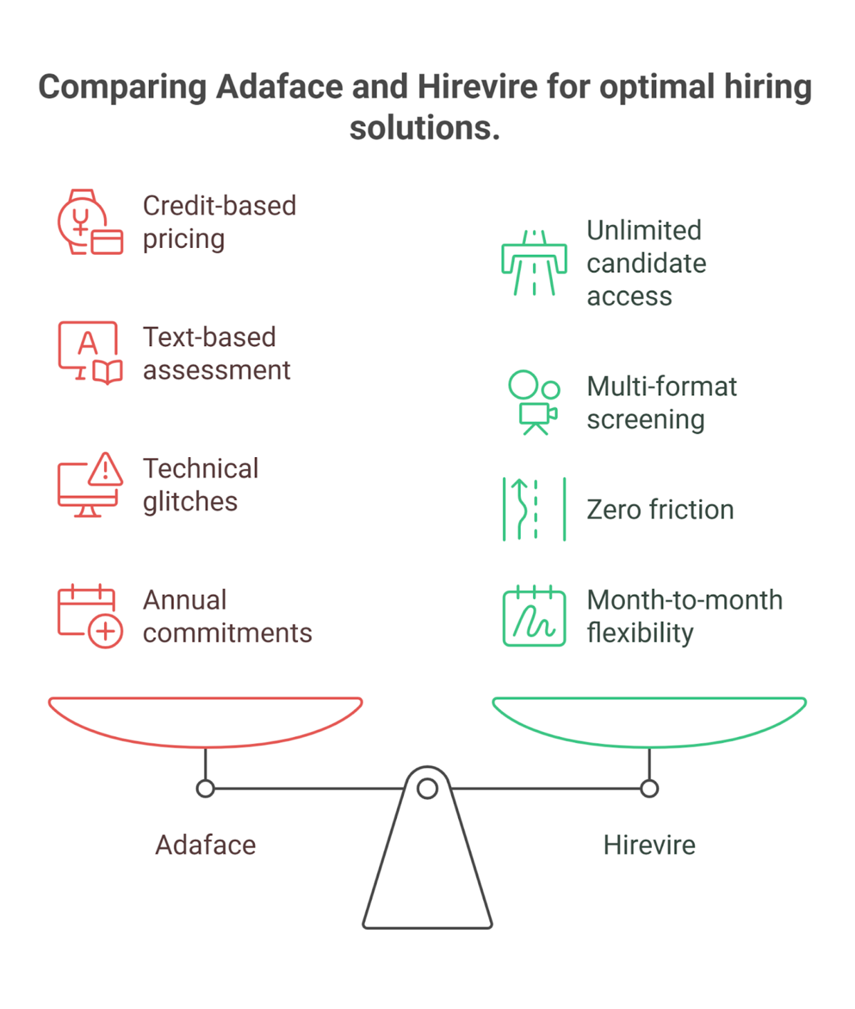 However, critical limitations make Adaface unsuitable for many organizations. The credit-based pricing becomes extremely expensive for high-volume hiring ($5,000-$20,000 annually). Text-based assessment misses personality, communication skills, and cultural fit that video screening provides. Technical glitches and annual commitments create operational friction.