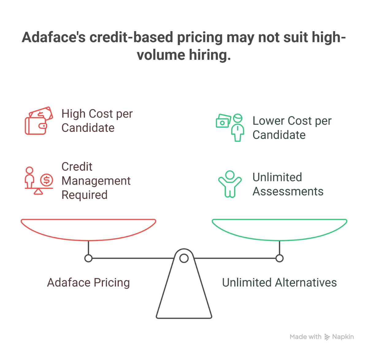 Critical insight: "Paying $15 per candidate doesn't make sense for 1000s of applicants." The per-candidate cost makes Adaface prohibitively expensive for high-volume hiring compared to unlimited alternatives.