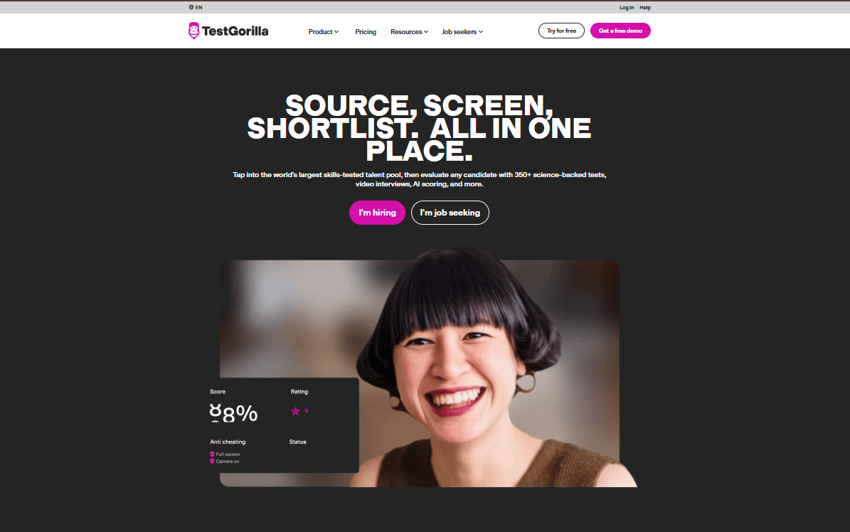 | 5. TestGorilla | Skills assessment | $142/mo | 4.5/5 (1300+) | 4.2/5 (250+) | ❌ | ❌ |