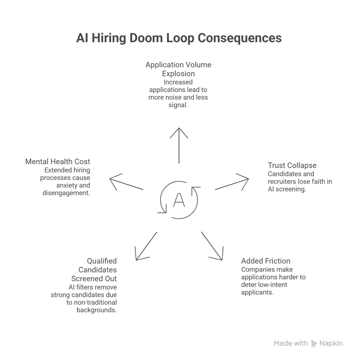What makes this particularly hard to solve is that each side's behavior is rational given the other's. Candidates mass-apply because they know AI filters reject resumes algorithmically, so volume is a hedge. Companies add more AI filtering because volume is too high to review manually. The loop becomes self-reinforcing because fixing it requires one side to change behavior while the other does not — and neither side has reason to move first.