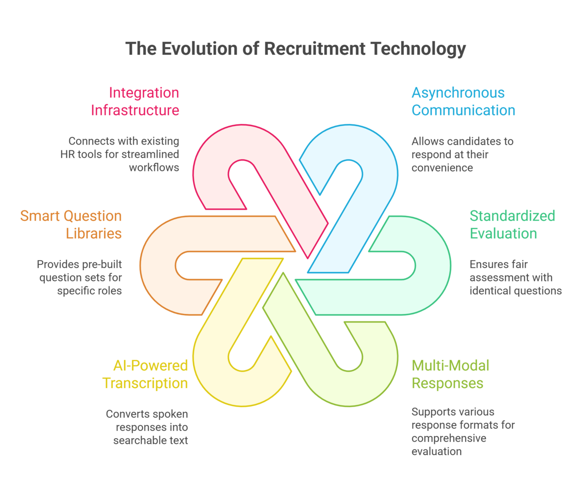 Multi-Modal Responses: Beyond traditional video, platforms now support audio recordings, text submissions, and file uploads for comprehensive candidate evaluation.