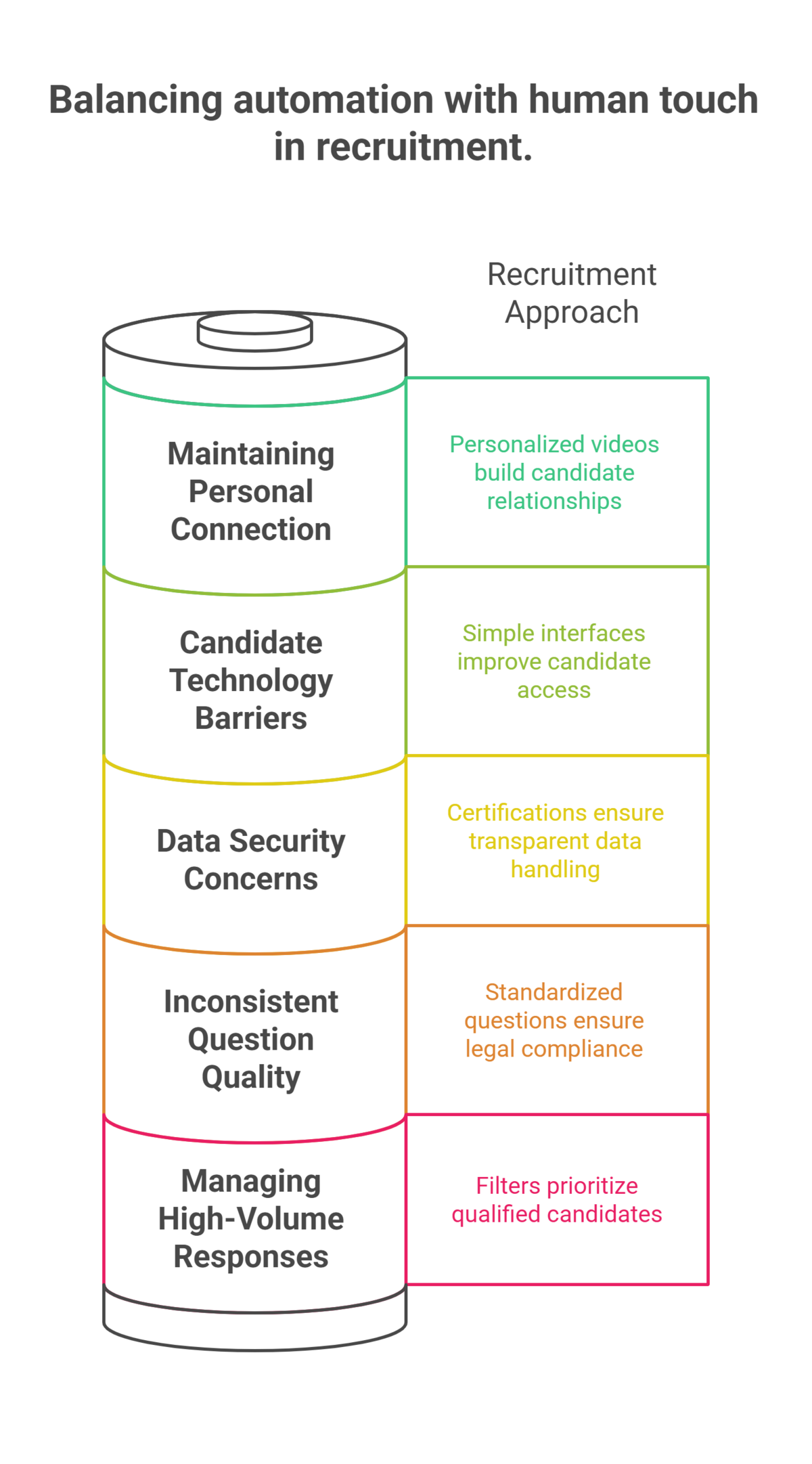 Solution: Include personalized introduction videos from hiring managers. Send follow-up communications acknowledging receipt of responses. Use automated interviews as one step in a broader, relationship-focused recruitment process rather than the sole candidate interaction.