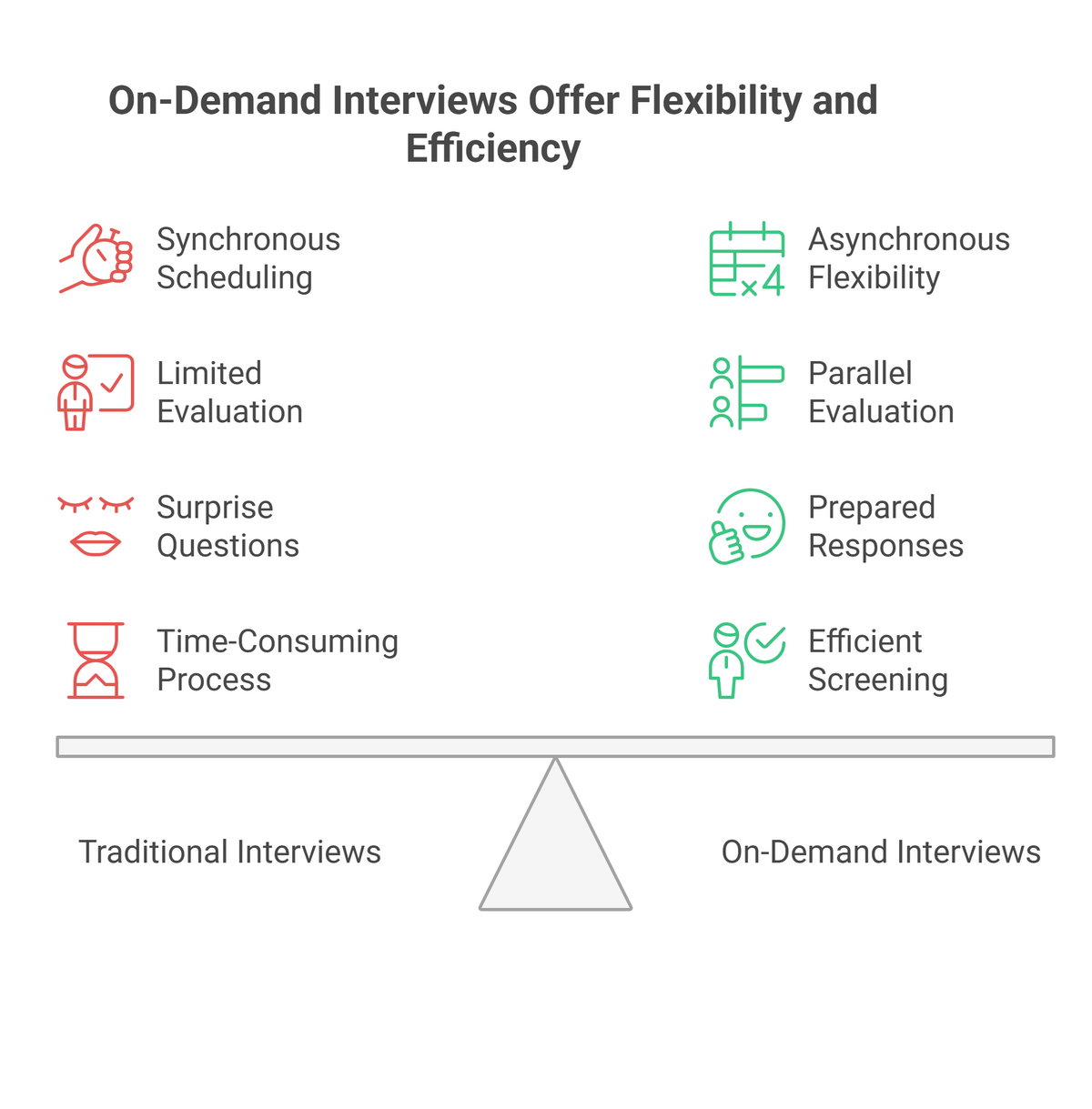 Traditional interviews are synchronous - everyone must be available at the same time. On-demand interviews are asynchronous - candidates respond when it works for them, recruiters review when it works for them.