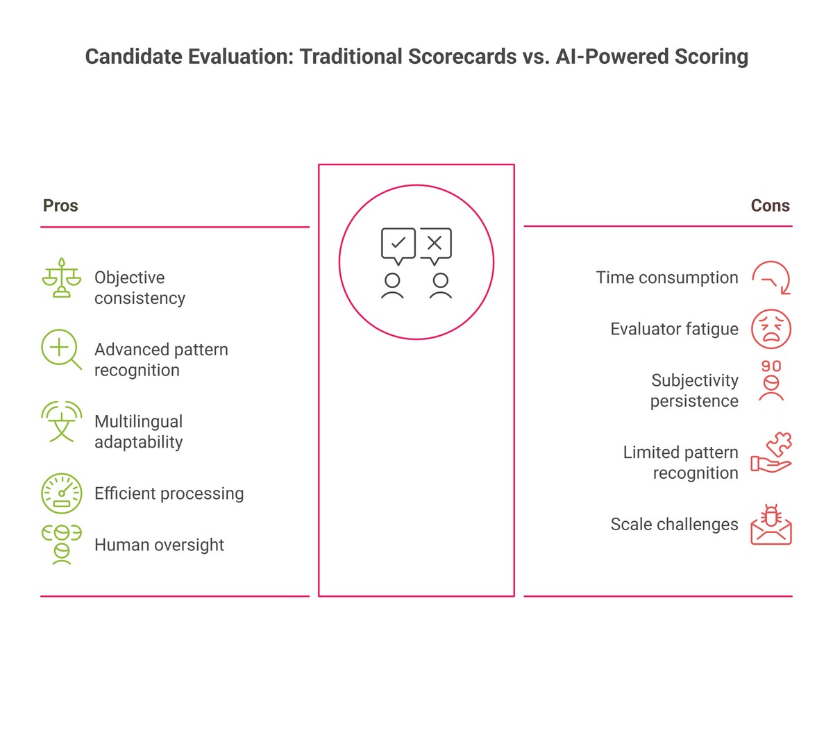 Traditional scorecards laid important groundwork by introducing structure to hiring decisions. However, the future belongs to intelligent evaluation systems that combine human insight with technological capabilities, ensuring every candidate receives the thorough, unbiased assessment they deserve.