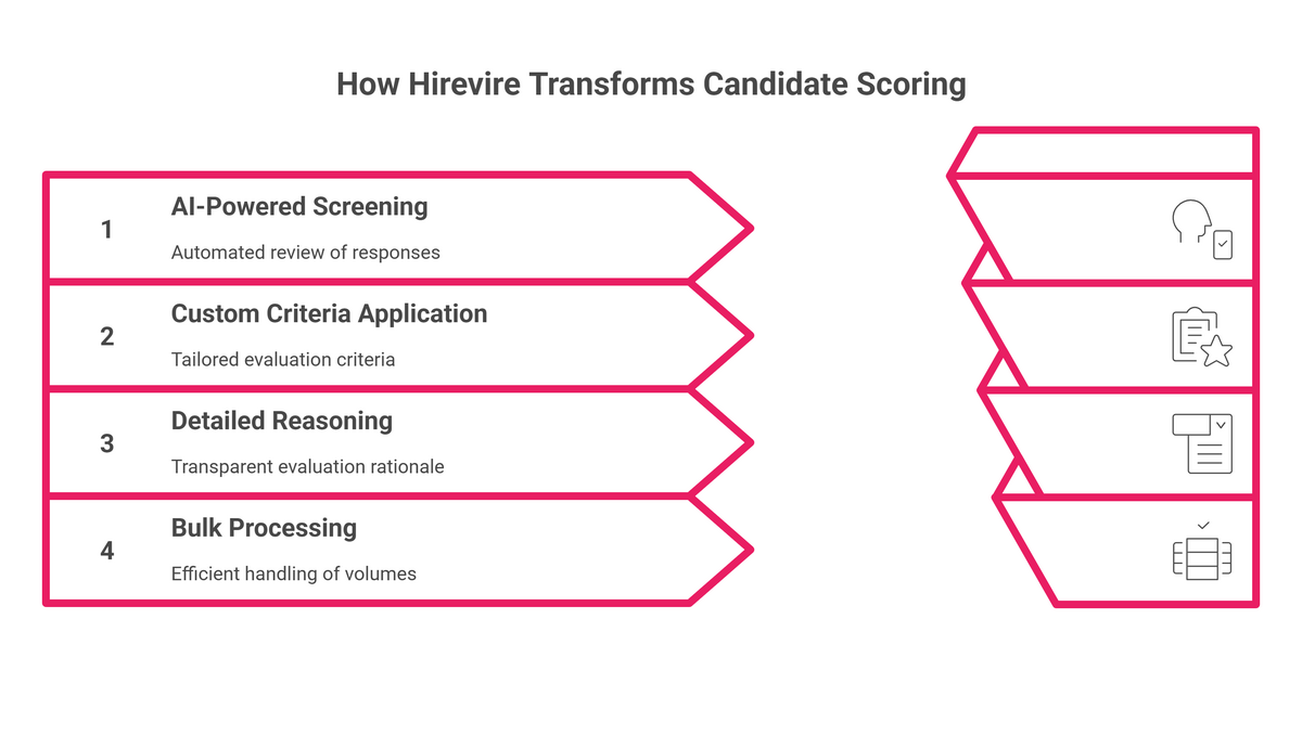 AI-powered systems like Hirevire represent the natural evolution of candidate assessment, combining scorecard structure with intelligent analysis that processes video responses and provides detailed reasoning across 90+ languages.