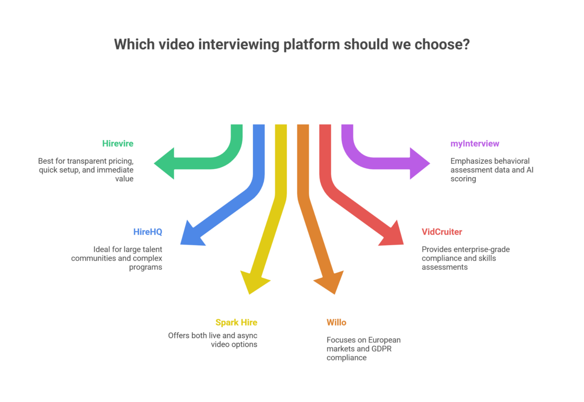 Other solid alternatives include Spark Hire at $299 monthly for established live plus async video, Willo at $89 monthly emphasizing GDPR compliance and ID verification for European markets, VidCruiter with custom pricing for enterprise needs including assessments, and myInterview at $199 monthly for behavioral insights particularly in Asia-Pacific regions.