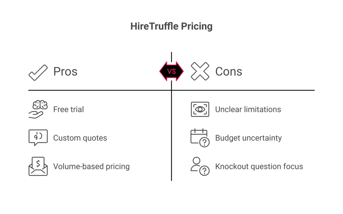 Custom quotes: For higher volumes or special requirements, HireTruffle directs customers to contact their sales team for custom pricing. This approach makes sense for complex enterprise needs but creates budget uncertainty for mid-sized companies trying to forecast costs accurately.