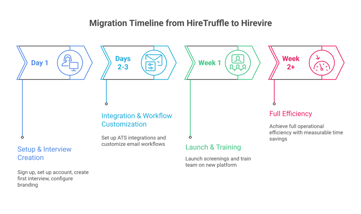 Export candidate data from HireTruffle (CSV/videos) in under an hour. Hirevire setup takes under 10 minutes—create interviews, customize branding, and configure integrations without technical expertise. Run both platforms simultaneously if needed during transition, though most users switch entirely within one week.