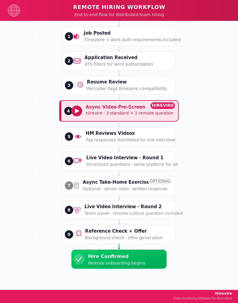 Remote hiring workflows need adjustments at three points: sourcing (add timezone and work authorization requirements to the job description), pre-screening (add remote-work-specific questions about async communication and home setup), and interviews (standardize on one video platform and include questions about distributed work experience).