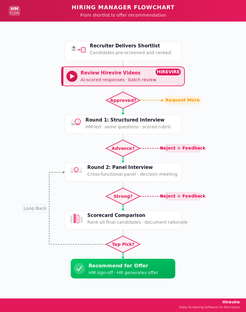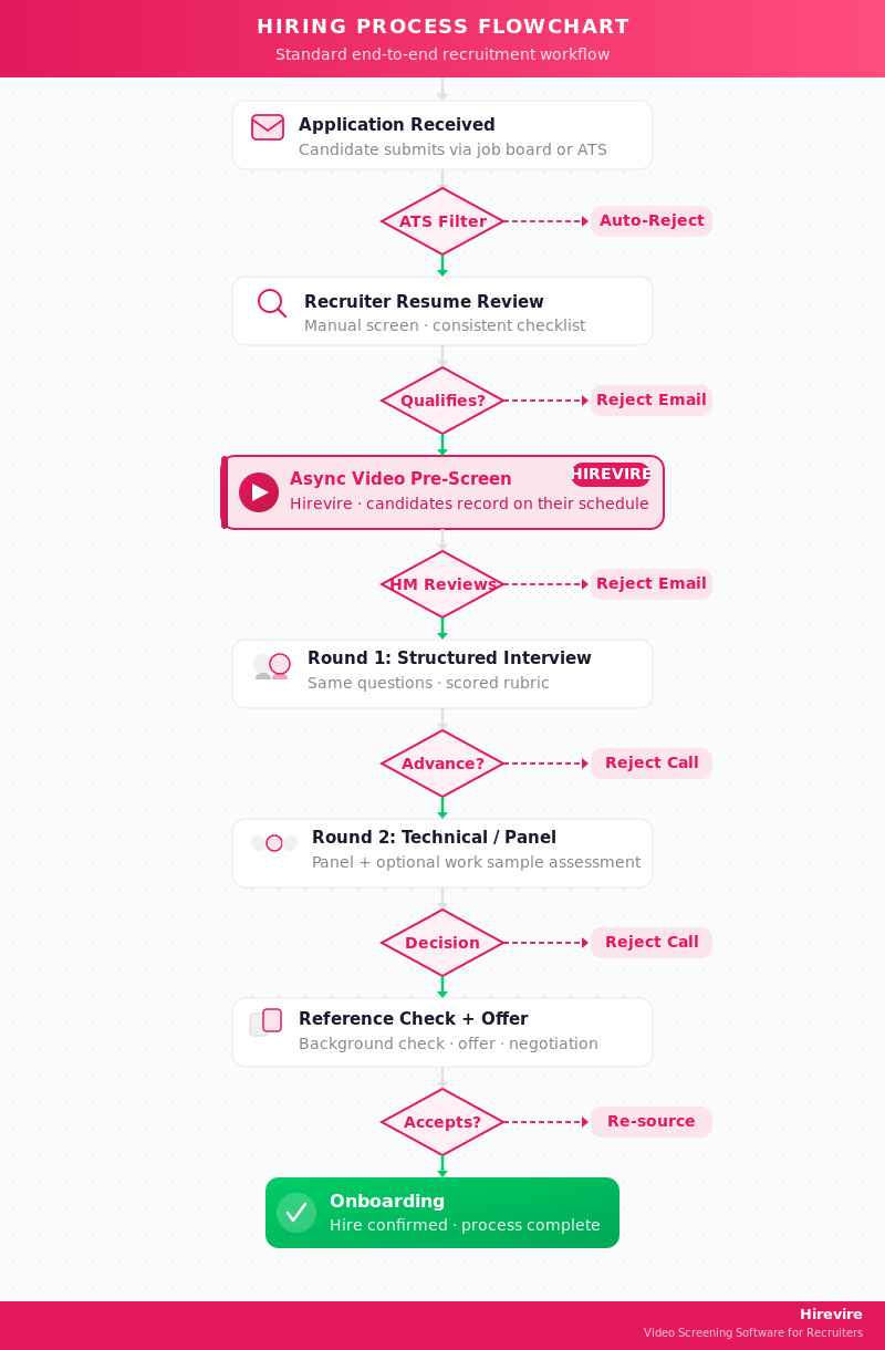 Quick Summary: This guide covers the standard 6-stage hiring workflow, downloadable flowchart templates, a RACI chart for recruitment teams, and workflow variants for remote and high-volume hiring. Hirevire fits into every workflow at the pre-screen stage, replacing phone screens with async video responses that candidates record on their own time.