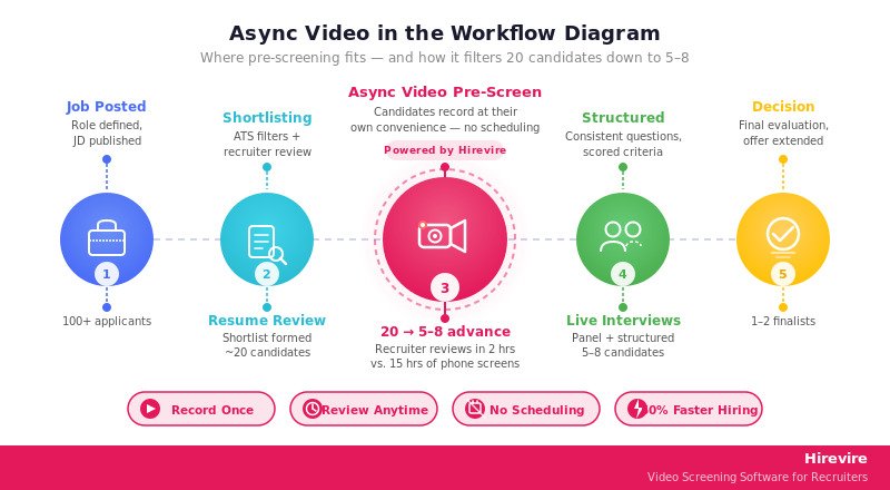 Async video pre-screening sits between resume review and live interviews. It solves the single most time-consuming part of early-stage screening: scheduling and conducting phone calls with 15-25 candidates.