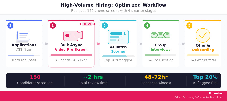 High-volume workflows need to prioritize speed and consistency over customization. The key differences from standard hiring: use bulk async pre-screening to process all candidates through the same question set simultaneously, use AI scoring to identify the top candidates before a human reviews anyone, and consider group interview formats to increase interview throughput.