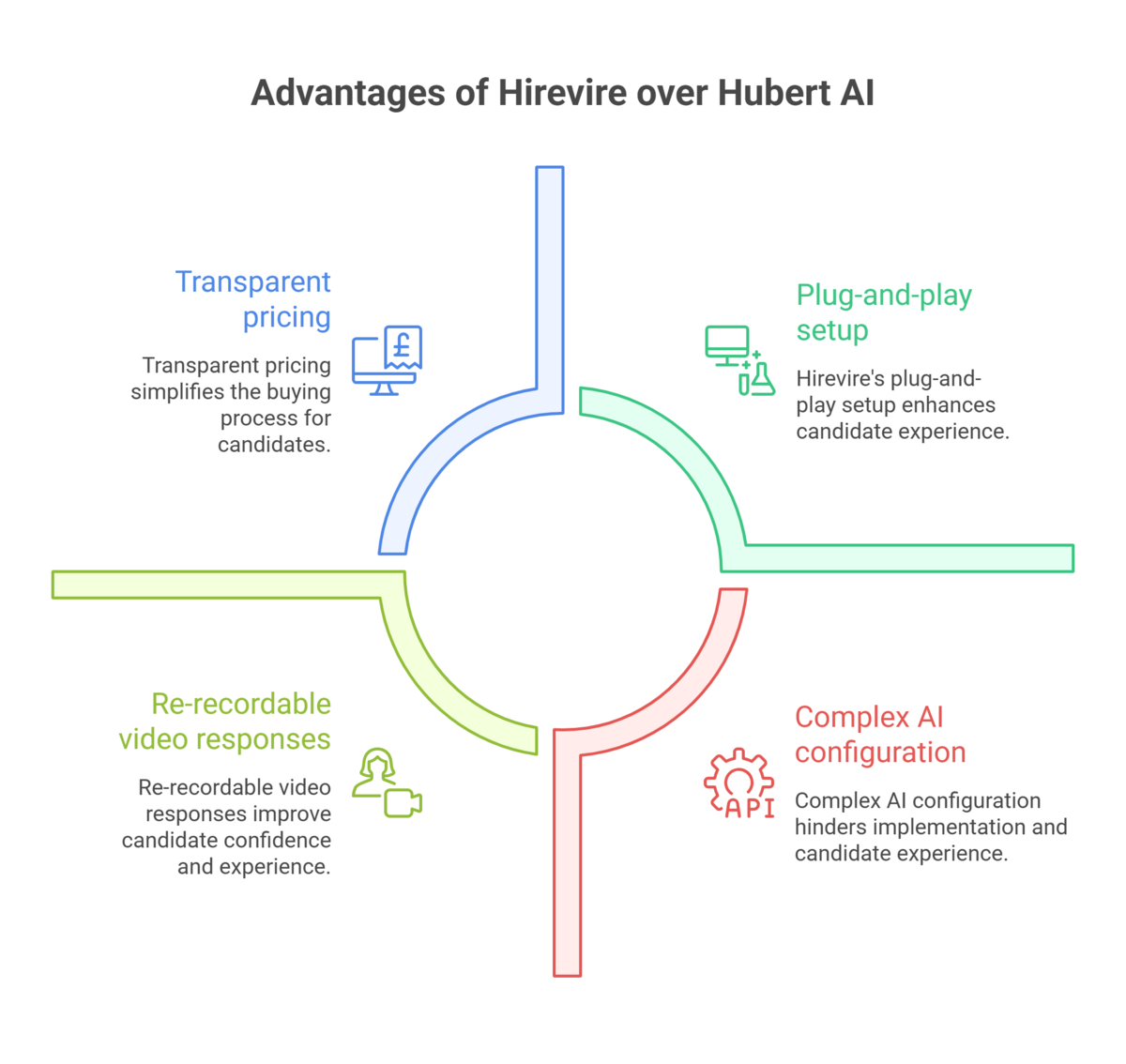 - Video vs. Text Chat: Hirevire's video format reveals communication skills, personality, and soft skills that Hubert AI's text chat fundamentally cannot assess - critical for sales, support, and client-facing roles