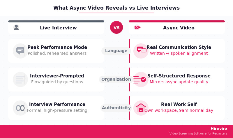 Async video pre-screening exposes communication quality under normal (not peak-performance) conditions. How clearly does the candidate organize their thoughts? Do they answer the question asked? Can they explain technical concepts without assuming shared context?