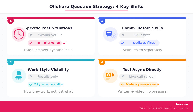 - Standard interview questions miss the specific risks in offshore hiring (communication quality, timezone management, async collaboration)