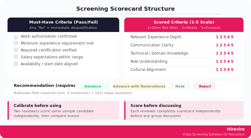 A screening scorecard is a structured evaluation form that applies consistent criteria to each candidate at a given screening stage. Scorecards reduce bias, improve consistency, and create documentation for compliance purposes.