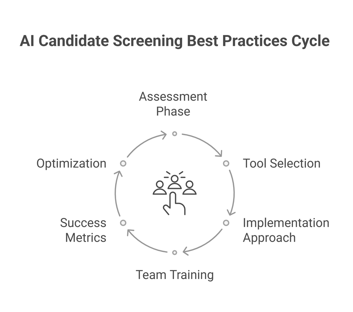 Successfully implementing AI candidate screening requires strategic planning and systematic execution. These proven practices ensure maximum ROI and smooth team adoption for recruitment agencies.