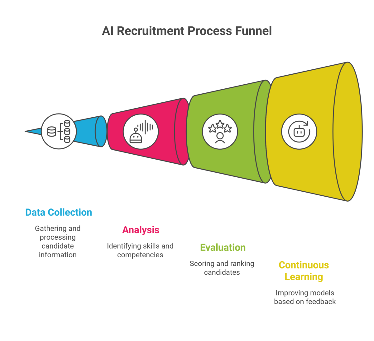 AI recruitment works through four stages: collecting and processing candidate data, analyzing data using NLP and machine learning to identify relevant skills, generating evaluations and rankings based on job requirements, and continuously learning from feedback to improve accuracy.