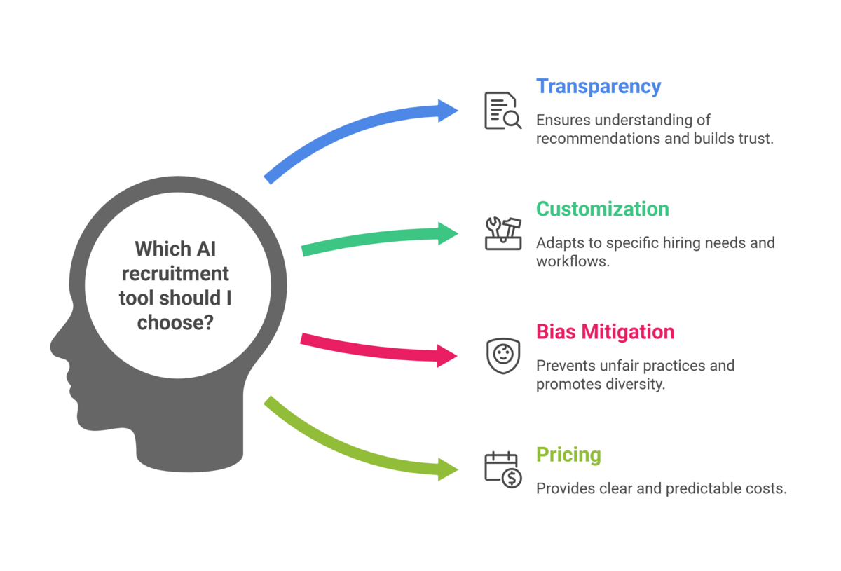 Evaluate based on required capabilities, candidate volume, integration requirements, budget, and implementation complexity. Prioritize transparency with tools providing detailed explanations, clear bias mitigation practices, and compliance with data protection regulations.