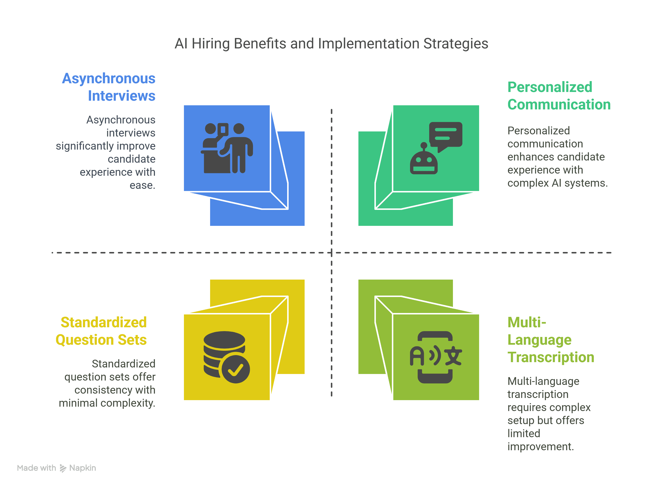 The candidate experience improvements are equally significant. With 80% of candidates better understanding job opportunities through video content and 46% more likely to consider positions that include AI hiring elements, these tools enhance recruitment marketing while streamlining operations.