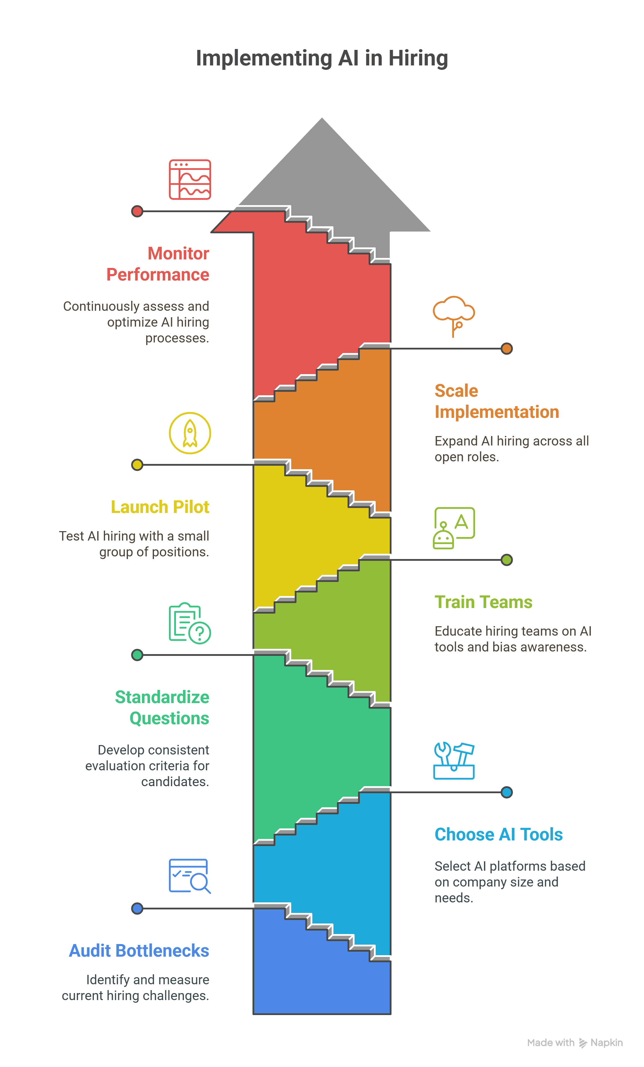 Implementing AI in hiring doesn't require a complete overhaul of your recruitment process. The most successful organizations take a systematic, phased approach that builds confidence while delivering immediate value. This step-by-step guide provides a proven roadmap for transforming your hiring process through strategic AI implementation.