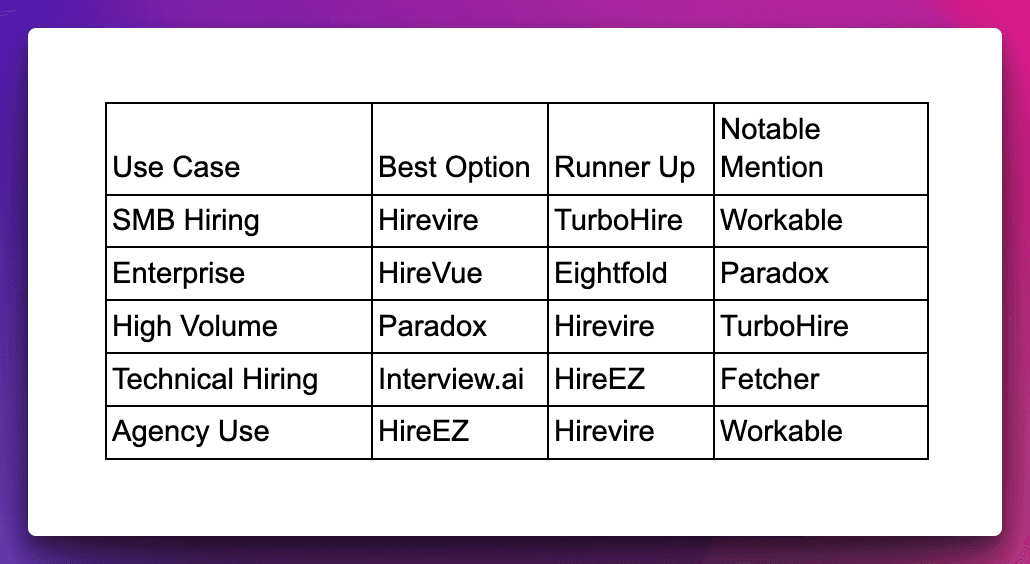 - Hirevire: Best for growing companies and SMBs, offering comprehensive video screening and unlimited responses
