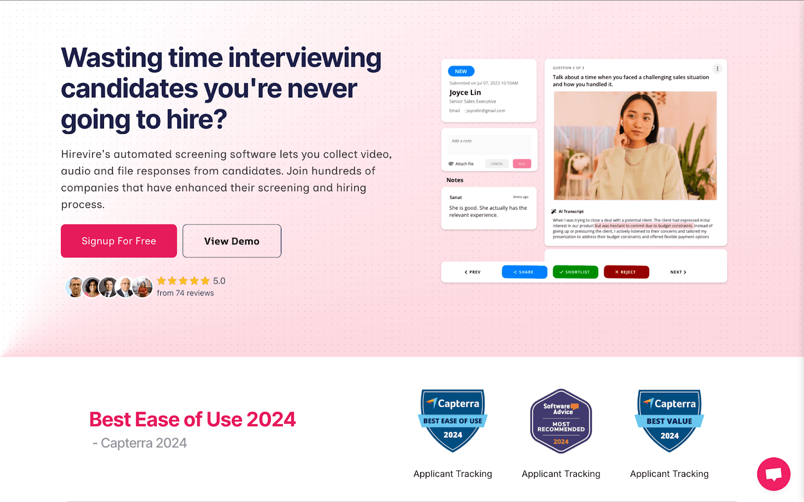 Hirevire is a comprehensive AI-powered screening platform that prioritises efficiency and accessibility. Recognised for "Best Ease of Use 2024" by Capterra, it offers a unique combination of advanced features at an industry-leading price point.