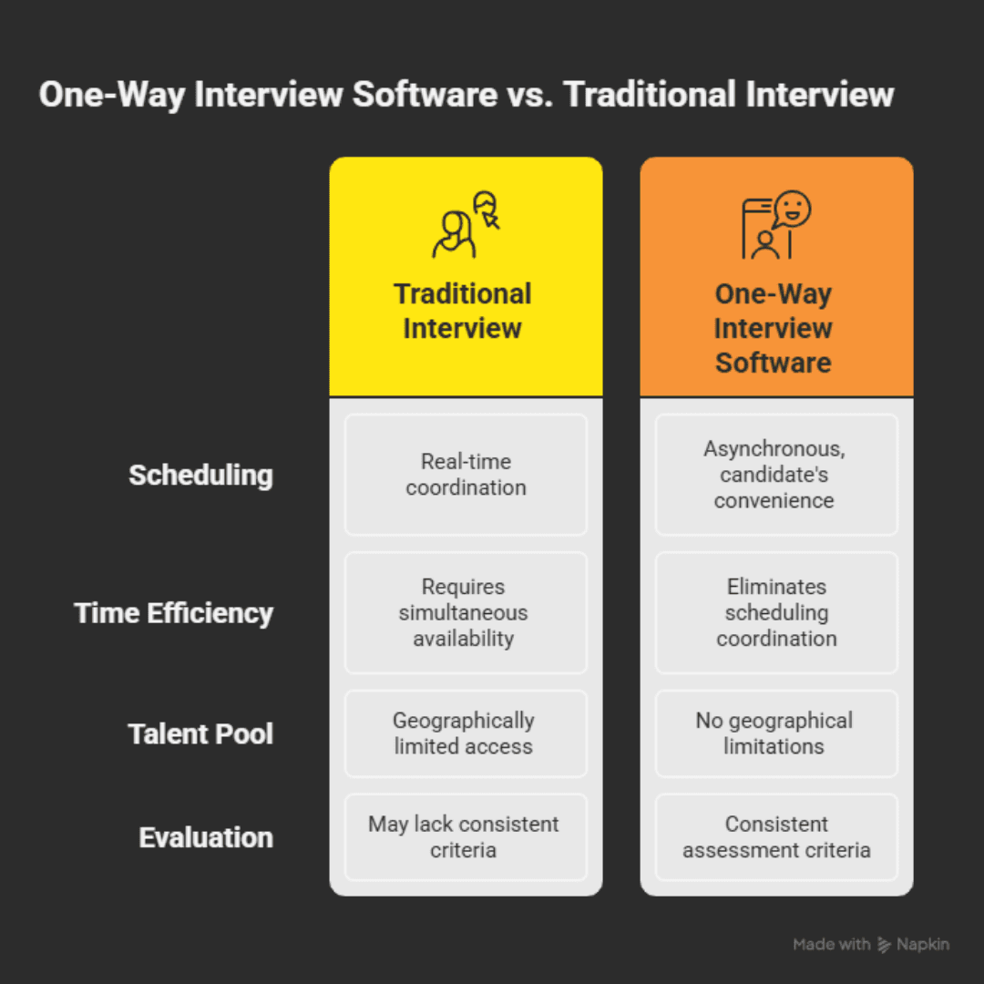 The fundamental shift from traditional interviewing to asynchronous video screening represents one of the most significant innovations in modern talent acquisition. One-way recruiting software, also known as asynchronous interview software or pre-recorded video interviewing platforms, enables candidates to record responses to predetermined questions at their convenience, which hiring teams can then review and evaluate on their schedules.