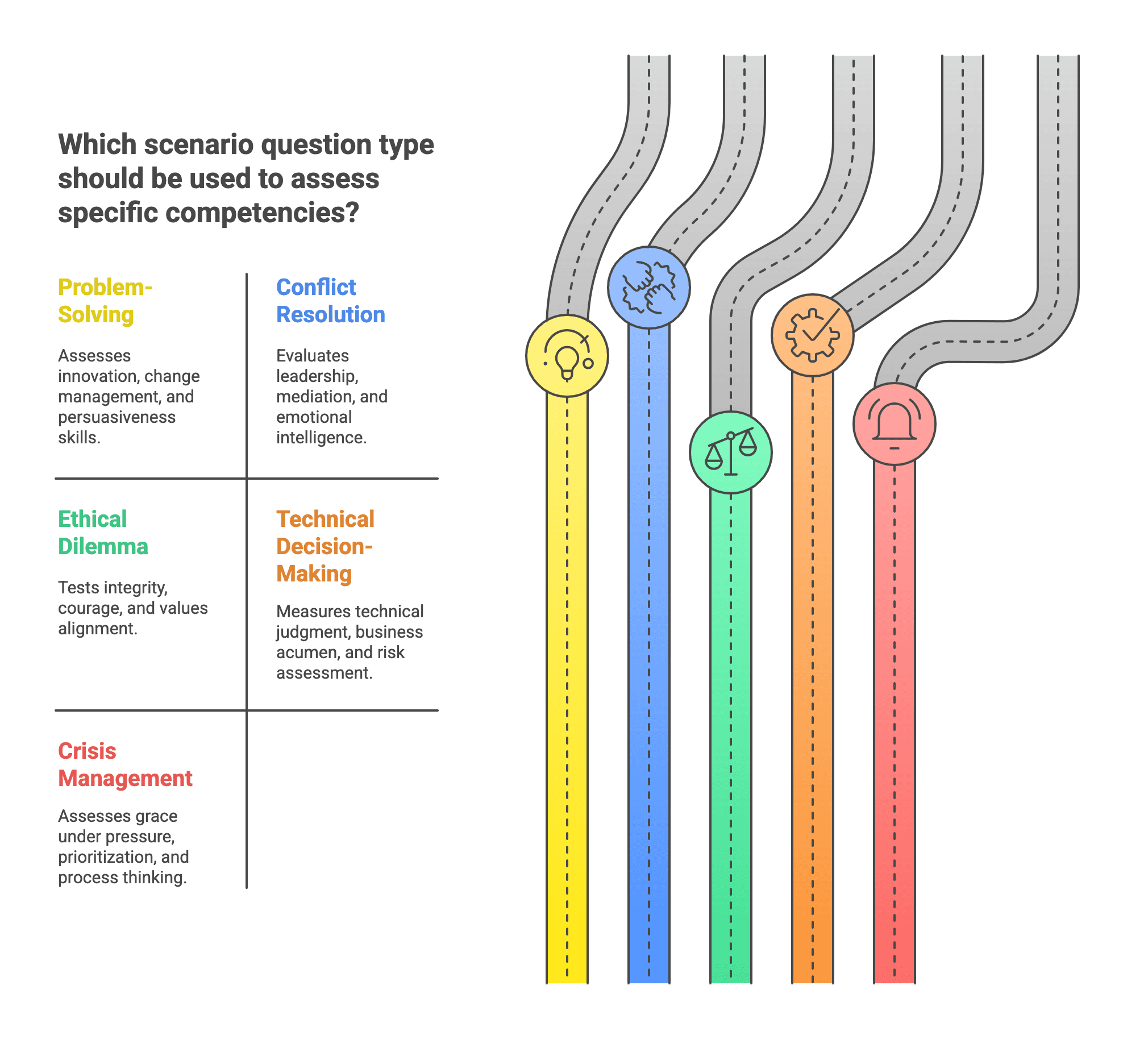 Unlike behavioral questions that focus on past experiences, scenario questions assess how candidates would handle situations they haven't yet encountered. This is particularly valuable when: