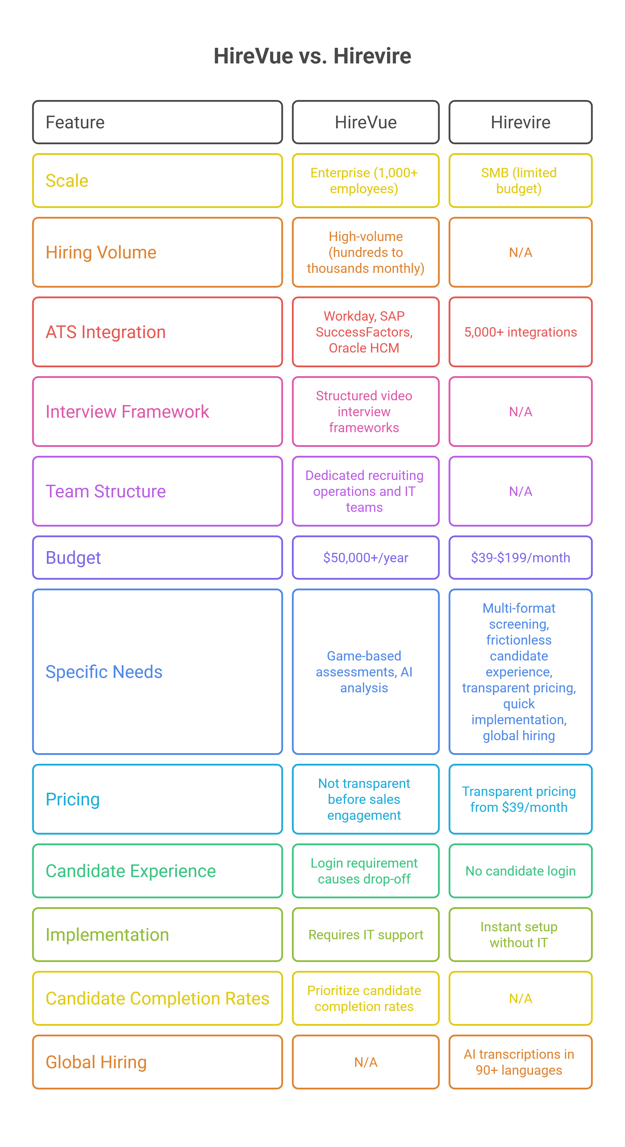 Not ideal for: Small to mid-sized businesses, startups needing transparent pricing, organizations requiring multi-format screening (audio/text/files), teams prioritizing frictionless candidate experience - For these use cases, Hirevire offers clear pricing starting at $39/month with multi-format responses and no candidate login requirement.