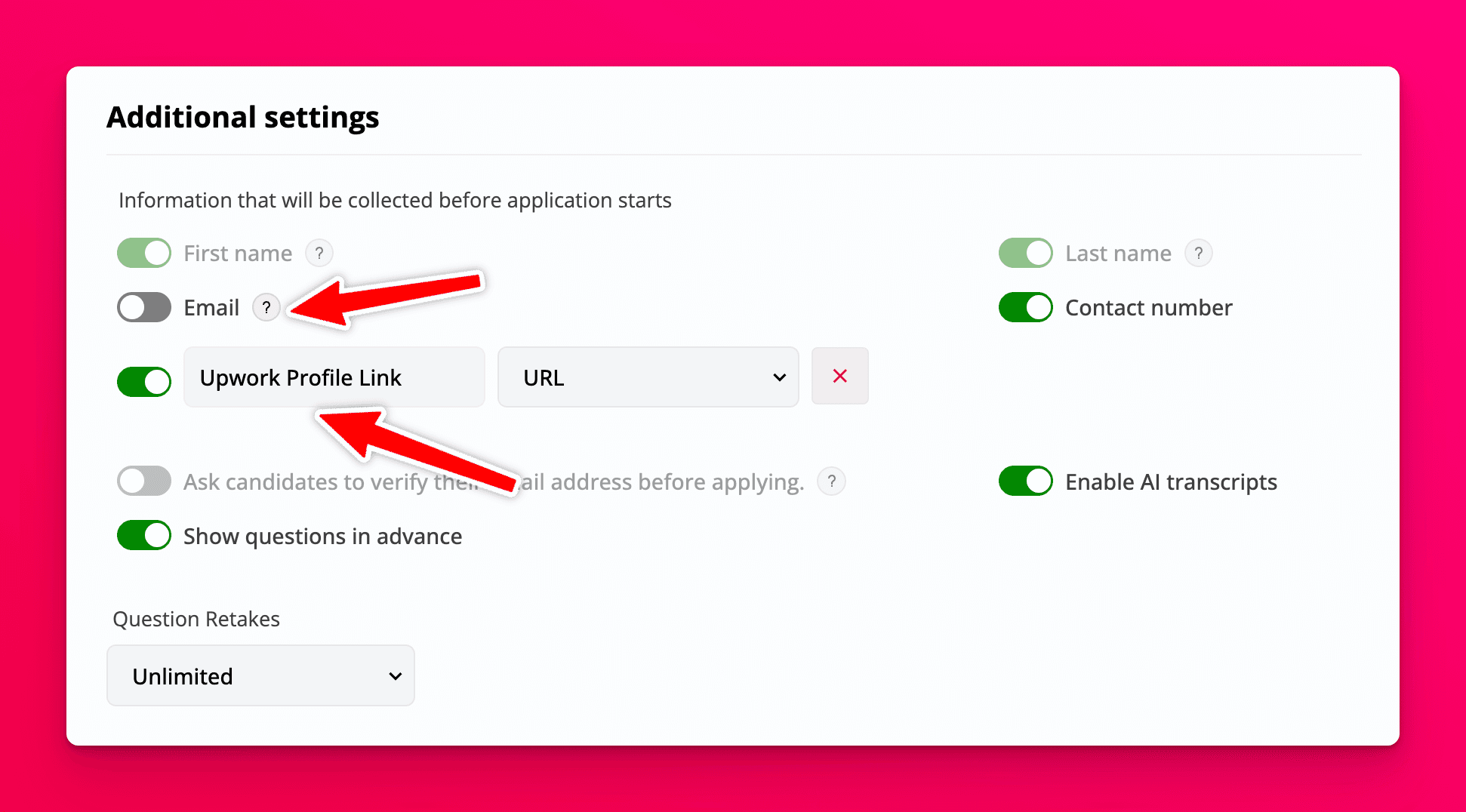 3. Flexible Identification: Use custom fields to gather identifying information that aligns with your hiring workflow and Upwork's guidelines.