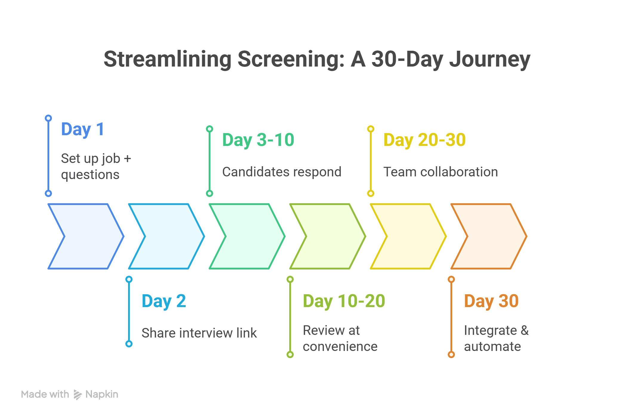 Day 1: Account setup and first job configuration (15 minutes) Week 1: First candidate batch, initial team feedback, question refinement Month 1: Workflow optimization, ATS integration setup, process standardization Month 2+: Scaled operations, measurable time savings, team adoption