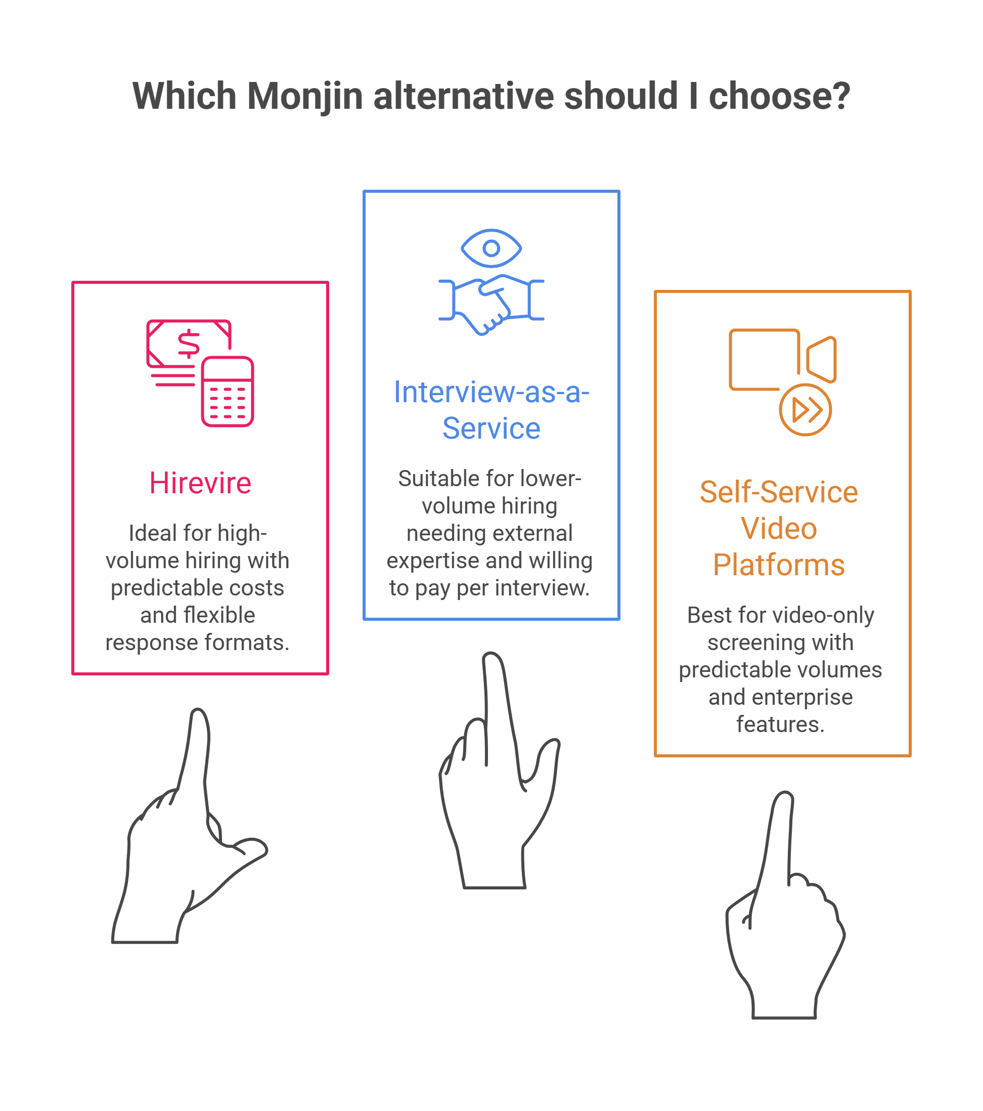 Quick Answer: Hirevire is the best Monjin alternative for most businesses due to its multi-format asynchronous interviews, no-login candidate experience, and affordable pricing starting at $39/month (billed yearly) or $49/month.