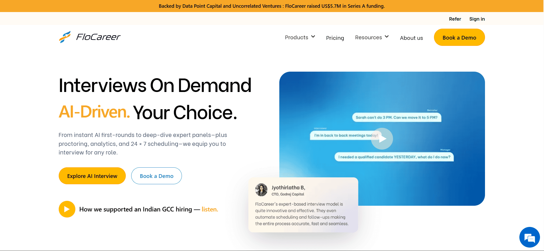 | 3. FloCareer | Cost-effective IaaS | $17/interview | Live technical | Outsourced |