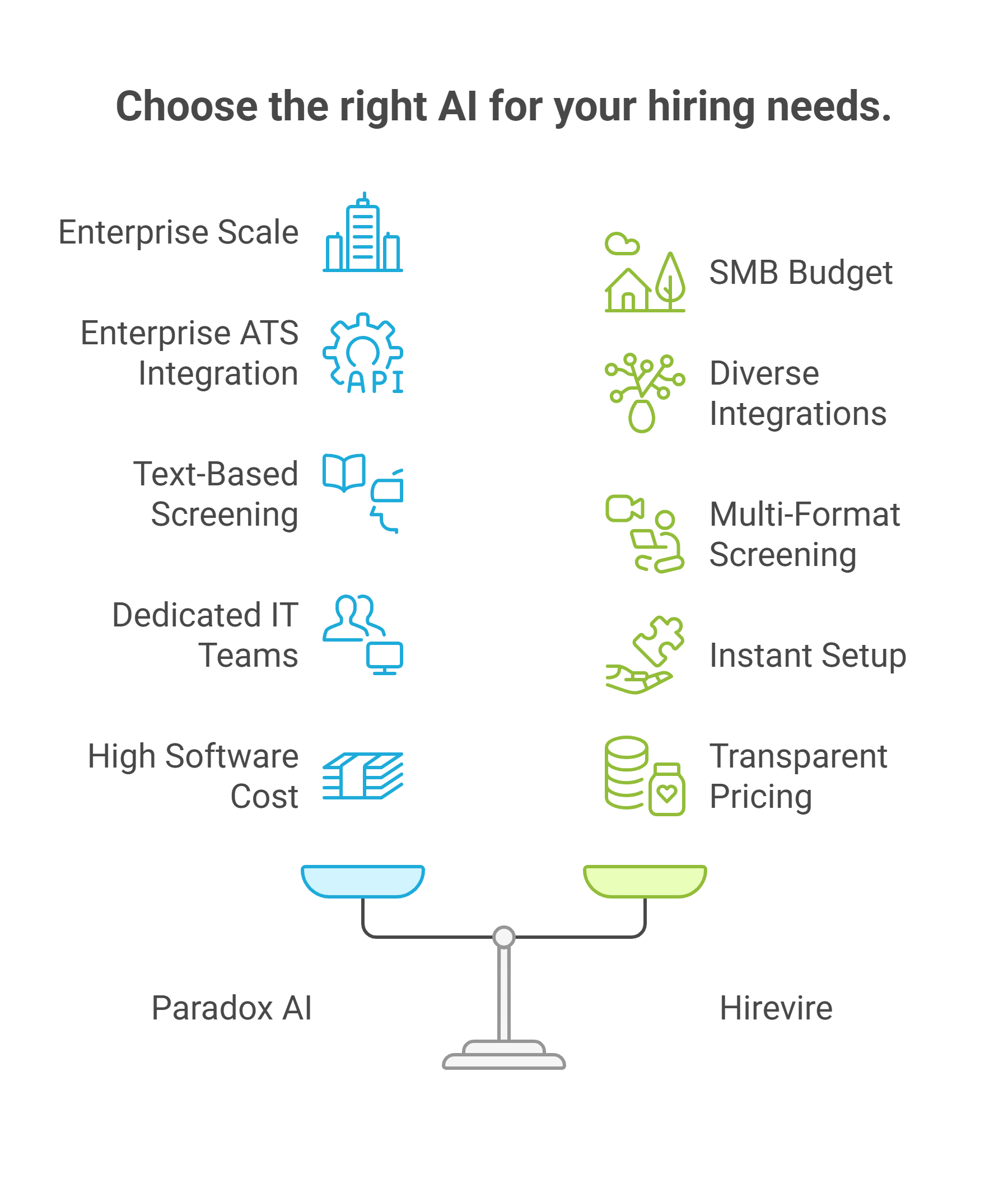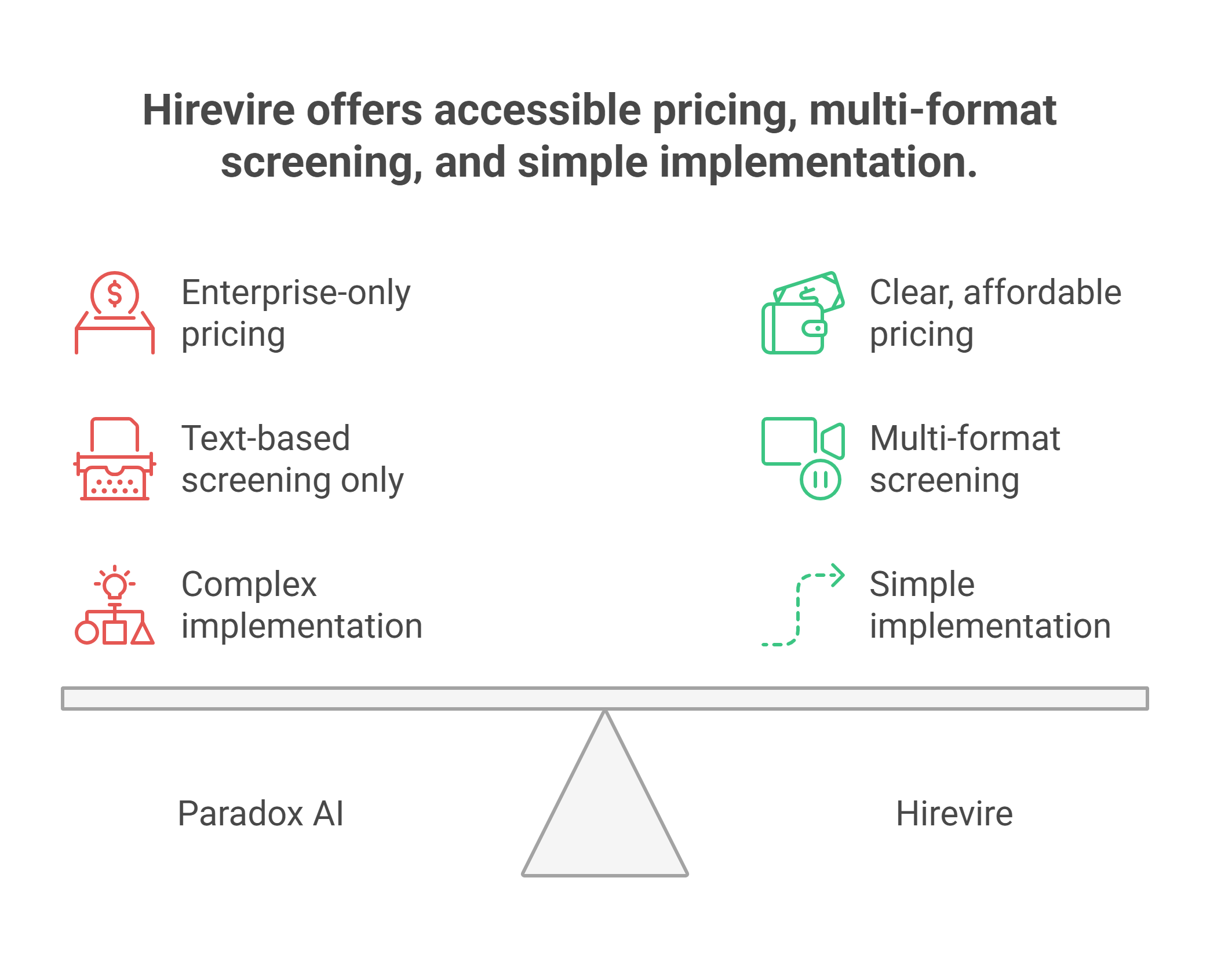 Our Recommendation: For small to mid-sized businesses, startups, or enterprises seeking flexible screening capabilities, Hirevire provides a more accessible, cost-effective alternative with superior multi-format screening capabilities.