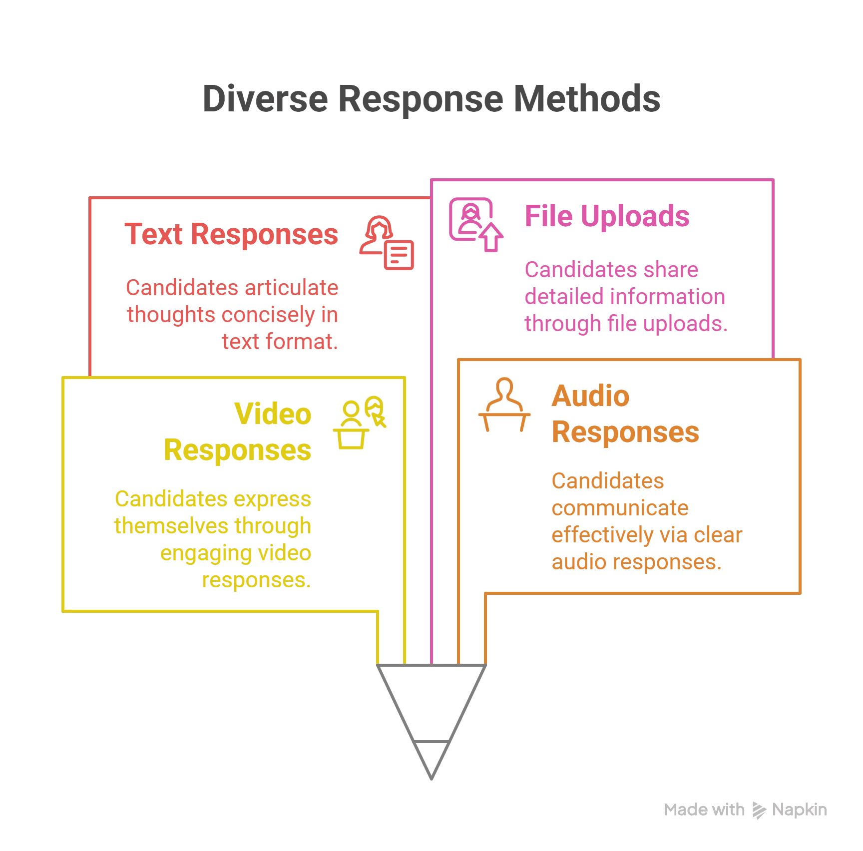 Multi-format responses set Hirevire apart from every competitor. Candidates can respond via video, audio, text, or file uploads—accommodating different comfort levels and accessibility needs while giving recruiters comprehensive insights into each applicant.