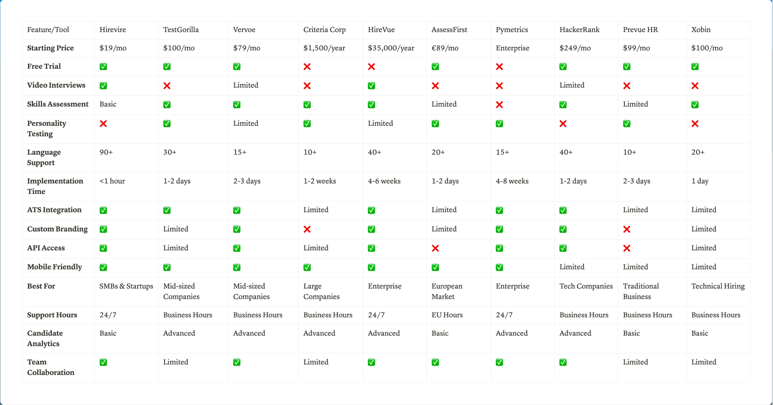 Hirevire leads the pack with its comprehensive yet affordable video interviewing and assessment platform. Perfect for small businesses, it combines enterprise-grade features with user-friendly design and SMB-focused pricing.