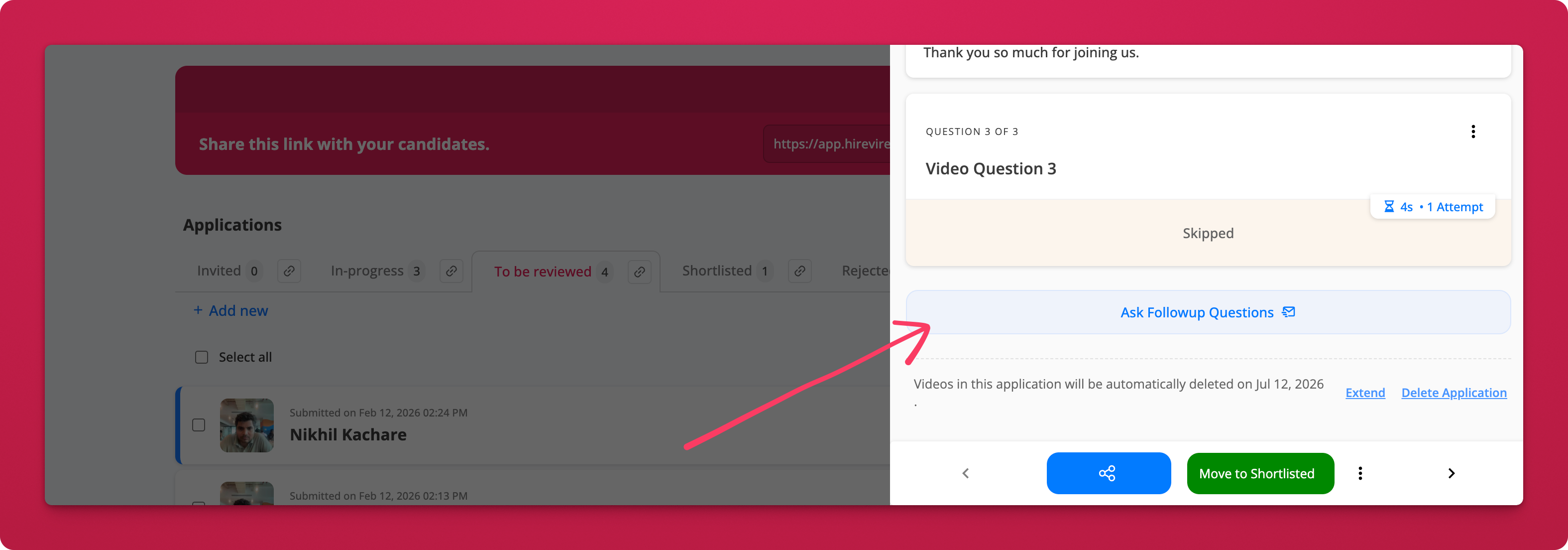 You asked, we built it. One of our most-requested features is now live — you can now send follow-up questions directly to individual candidates after reviewing their initial submission.