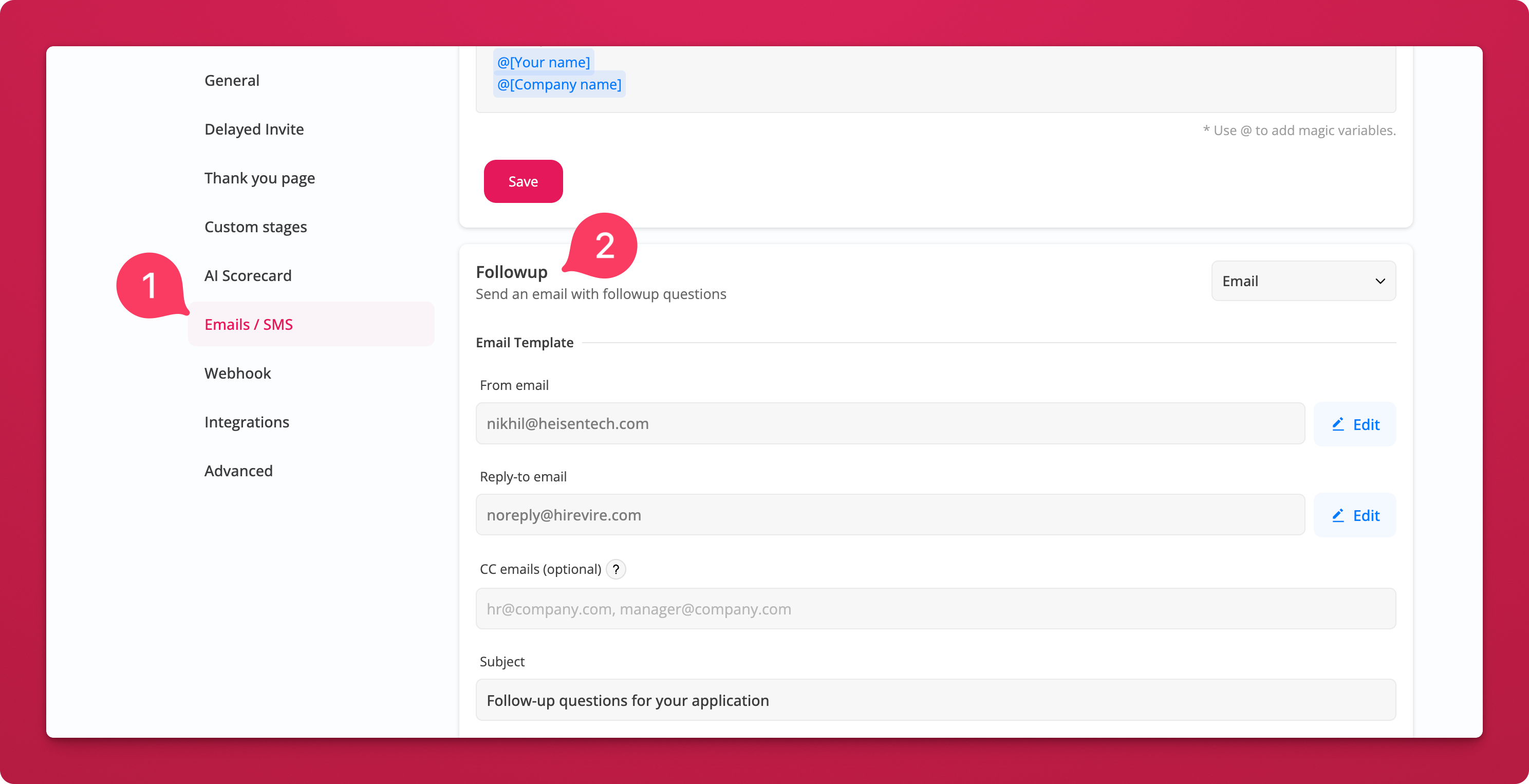 You can also customize the follow-up email template (sender, reply-to, subject, CC) from your job's Emails / SMS settings.