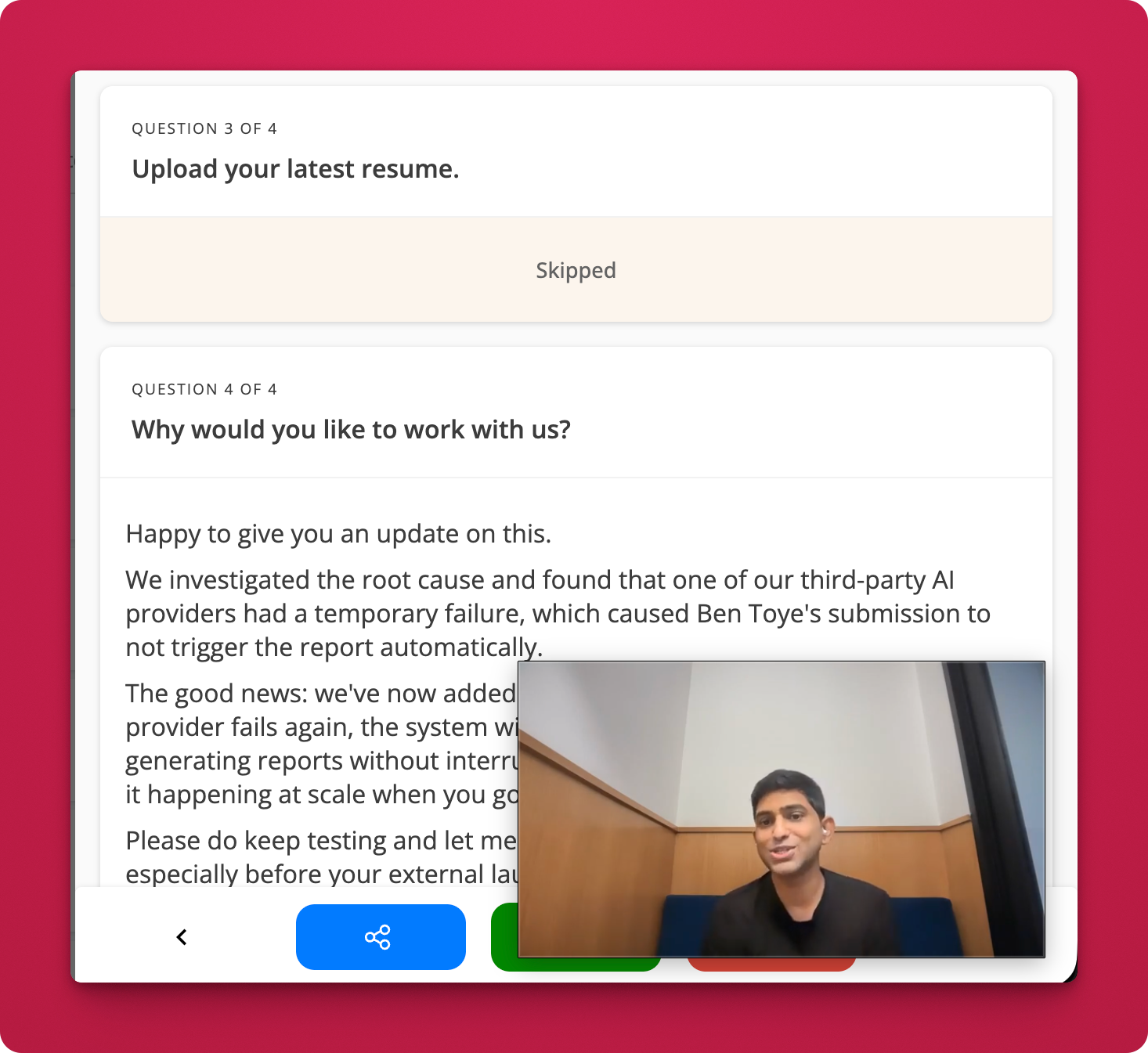 - Open any candidate submission and play a video response.