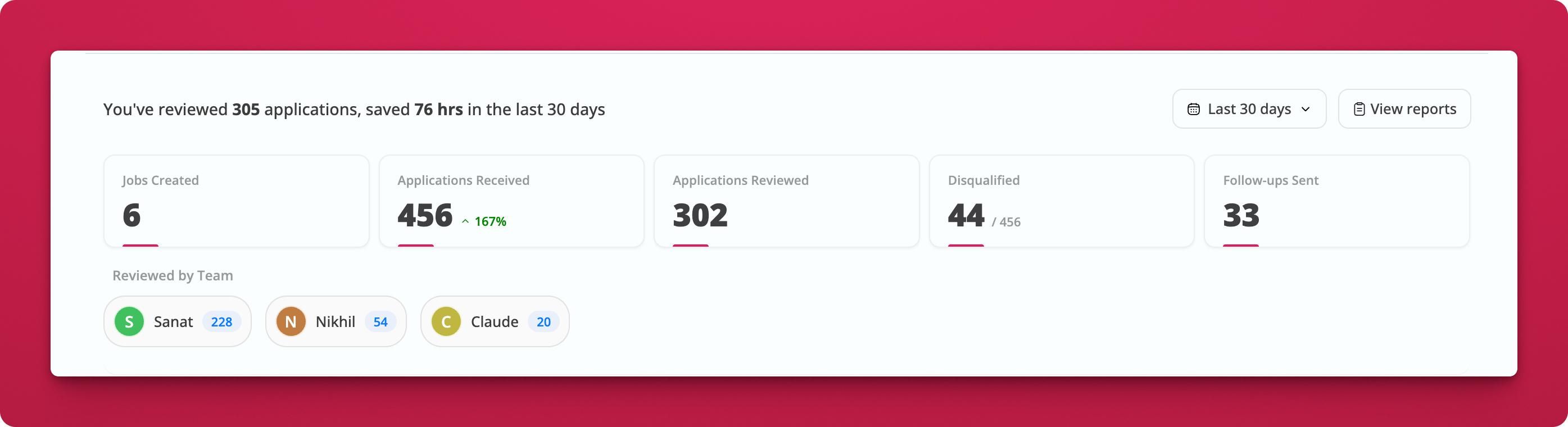 The admin home page now shows a snapshot of team activity — jobs created, applications received, reviewed, and disqualified, plus a "Reviewed by Team" breakdown — so you get the highlights without leaving the dashboard. Head to the Reports page for the full per-job, per-member breakdown.