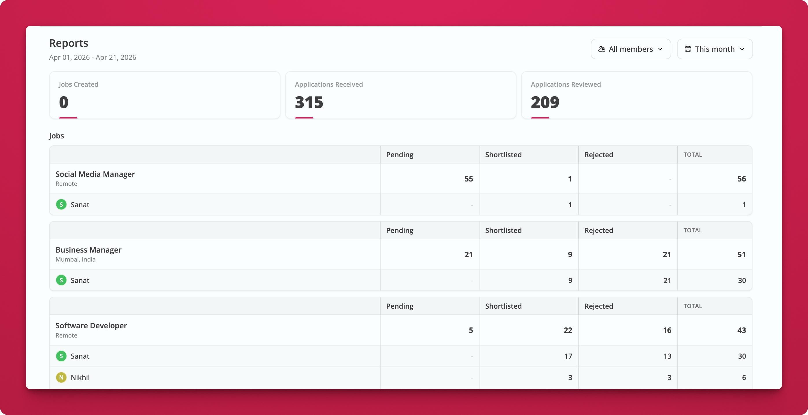 Click into Reports for the full breakdown: a per-job table with Pending, Shortlisted, Rejected, and Total counts, with each team member's individual contribution shown inline.