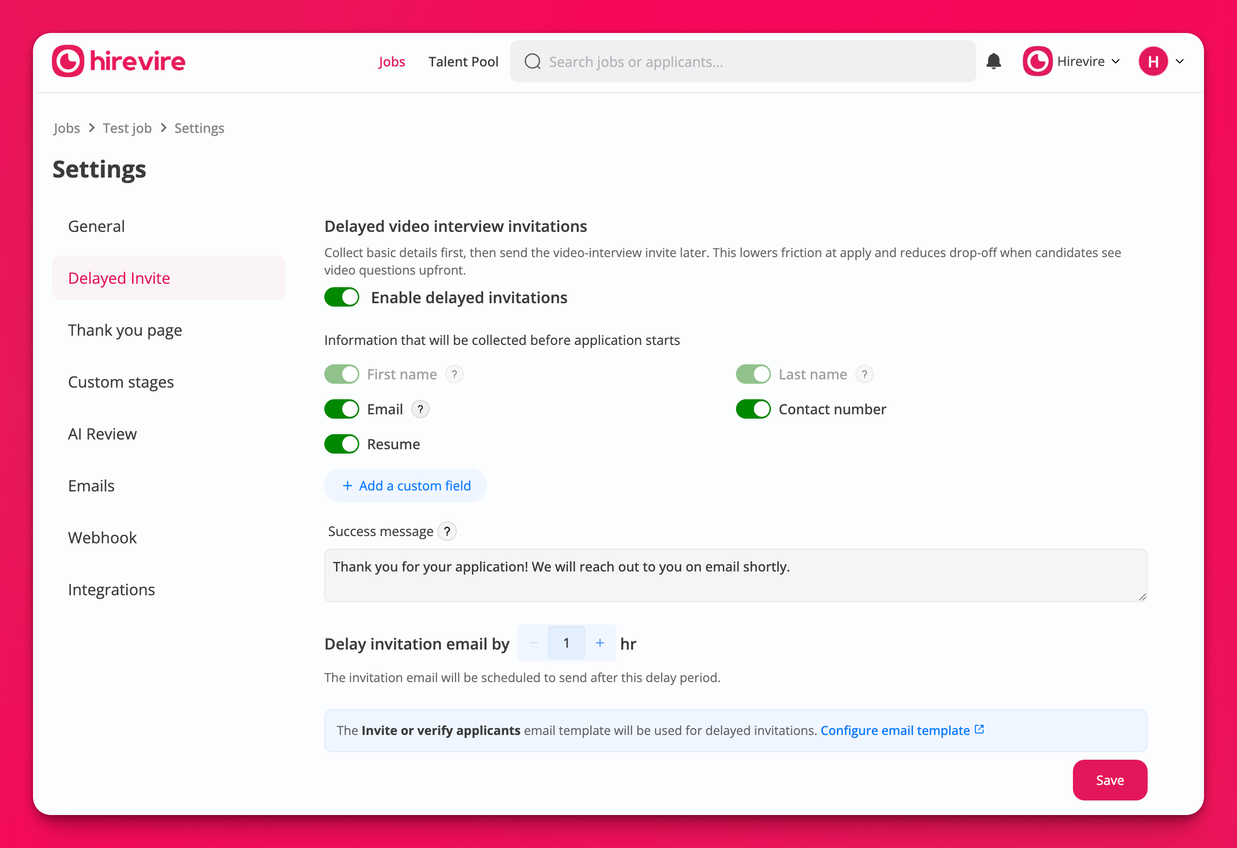 Delayed invitations let you collect basic candidate details first—like name, email, and phone—before automatically sending the full video interview invite after a set delay. This hides video questions upfront, reducing drop-off on your public application page.