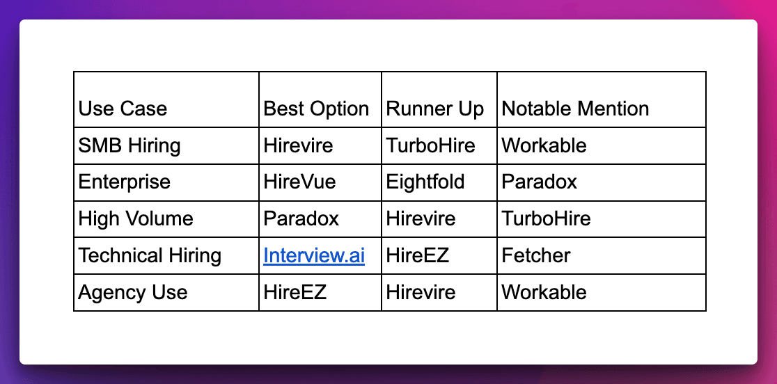 - Hirevire: Best for growing companies and SMBs, offering comprehensive video screening and unlimited responses