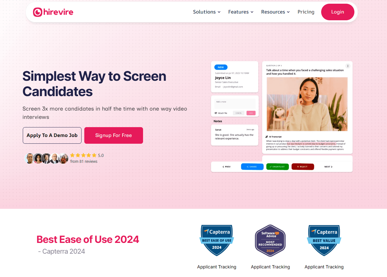 One-way and live interviews. Branding customization. Collaboration tools. Welcome videos and tagging